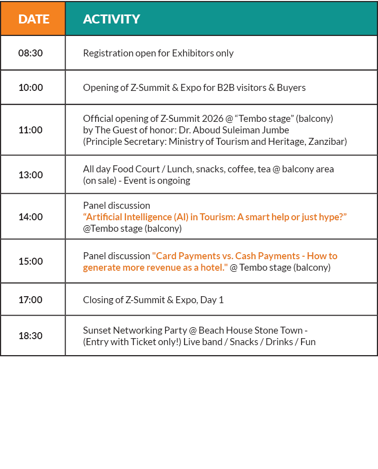 The Z-Summit is organized as a professional B2B Networking platform to connect Zanzibar Tourism stakeholders & Properties (120+ Exhibitors) with Travel Agents from Tanzania Mainland, East Africa and beyond (300+ registered Buyers).